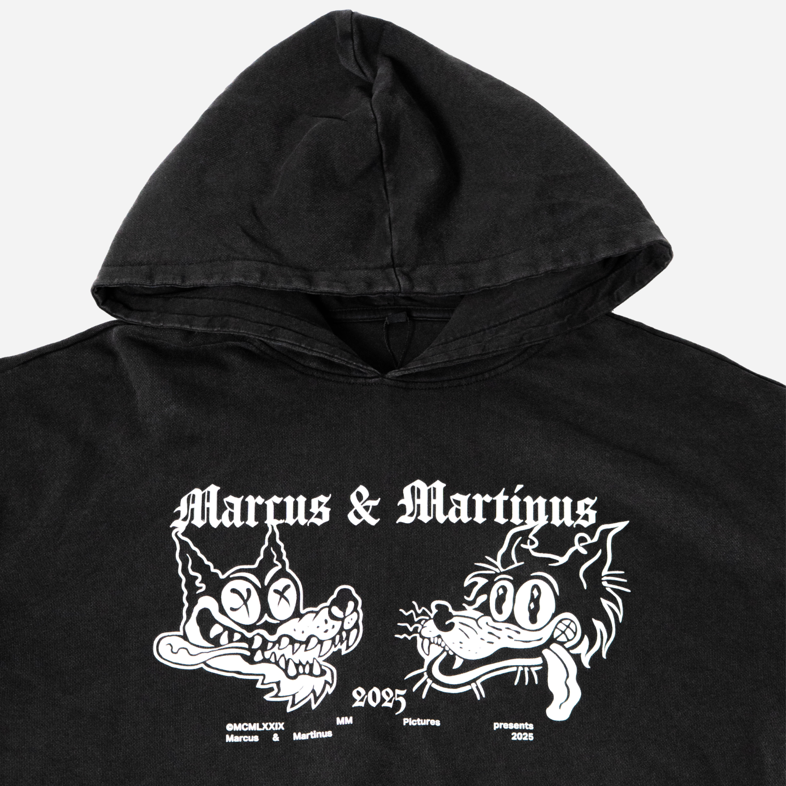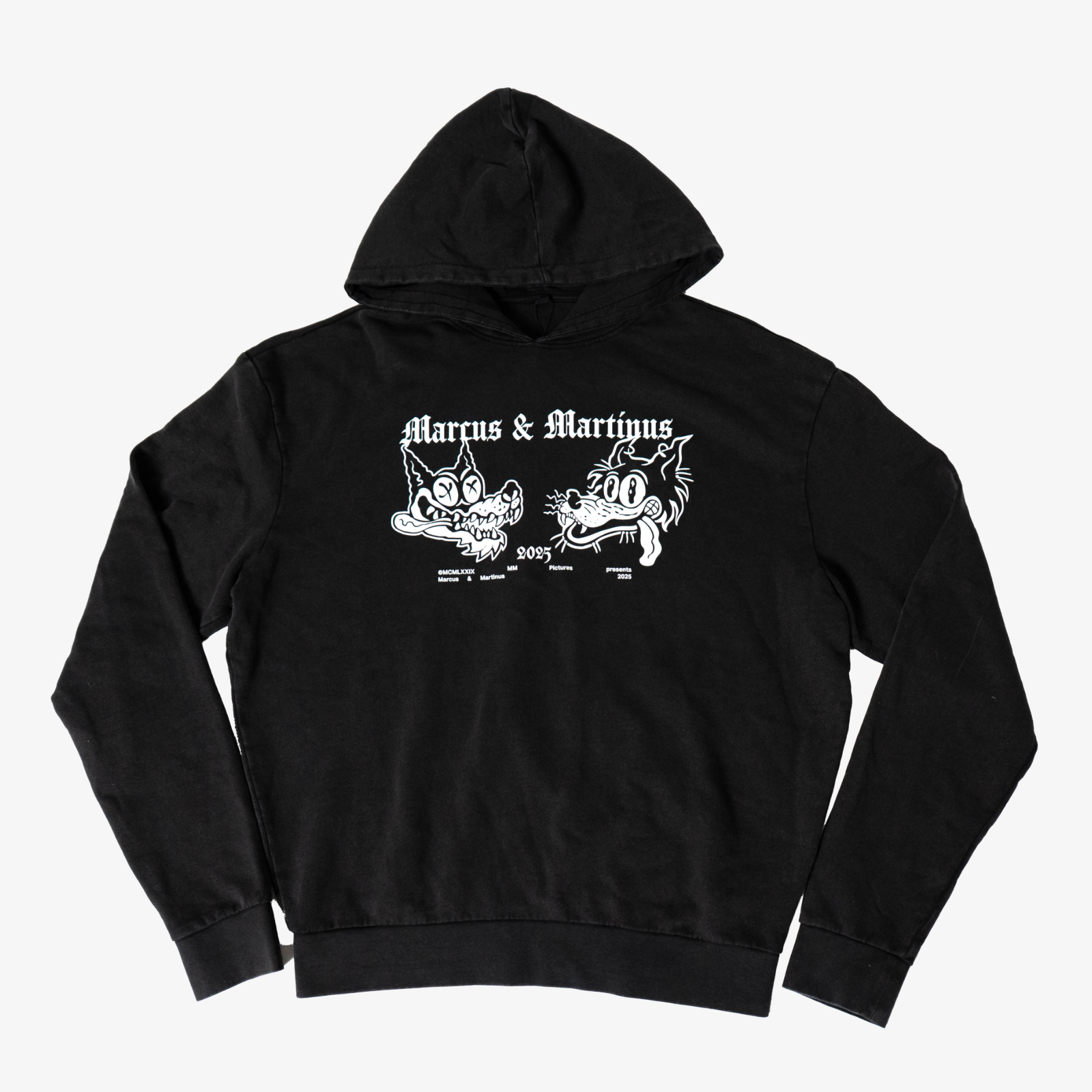 This is not your regular hoodie.This exclusive oversized hoodie is part of a limited drop.Crafted in washed black for that worn in street vibe, it features a bold white front print inspired by vintage cartoons with a modern twist. The gothic Marcus & Martinus logo completes the look, clean, loud, and made to stand out.