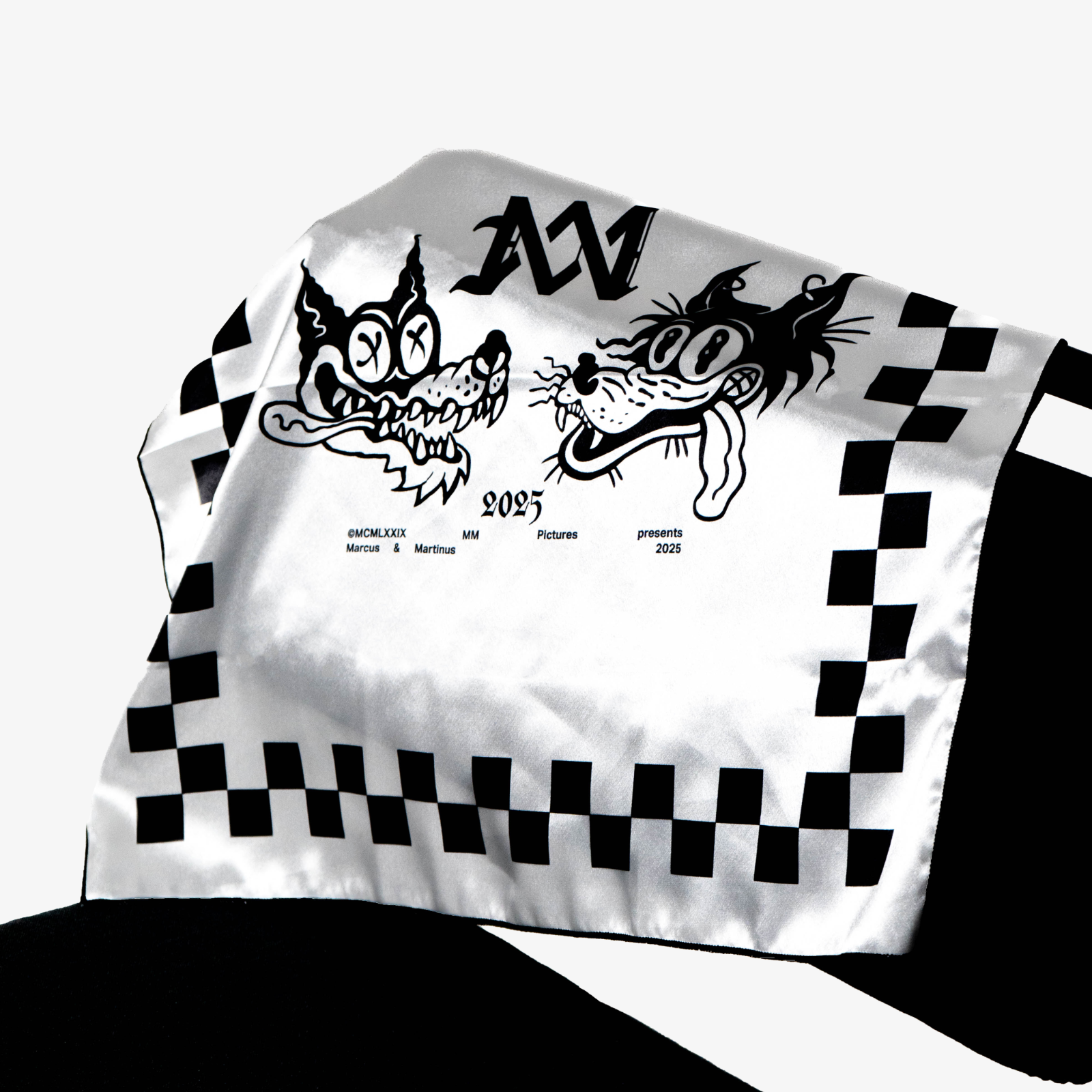 A bold statement piece in a compact format.This exclusive bandana is part of a limited drop of only 100 pieces, designed for those who pay attention to the details.Featuring a custom black-and-white print with vintage cartoon inspired artwork and the iconic Marcus & Martinus logo, it brings a strong graphic punch whether you wear it, style it, or collect it.